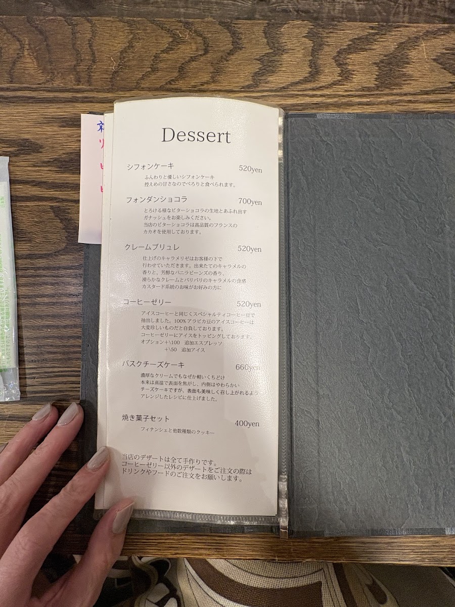 The menu offers a selection of delicious treats, featuring highlights such as the Decaf Coffee (デカフェ) priced at ¥530 and the Fluffy Chiffon Cake (シフォンケーキ) at ¥520. The decaf coffee here is not just ordinary; patrons rave about its transparent and smooth qualities, making each sip a refreshing experience. Complementing this, the chiffon cake is an absolute must-try, praised for its soft texture and balanced sweetness, paired wonderfully with a dollop of cream. Reviews mention the cake's lightness, making it a perfect choice for those evenings when you desire something sweet but not overwhelming.